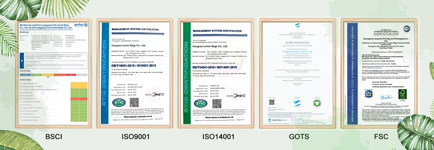 BSCI, ISO9001, ISO14001, ROHS, GOTS, GRS, FSC